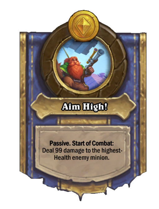 Aim High! is a Hero Power in Hearthstone Battlegrounds. Effect: Passive. Start of Combat: Deal 99 damage to the highest- Health enemy minion. Created by: Deadeye. This card is no longer in the pool (Legacy).