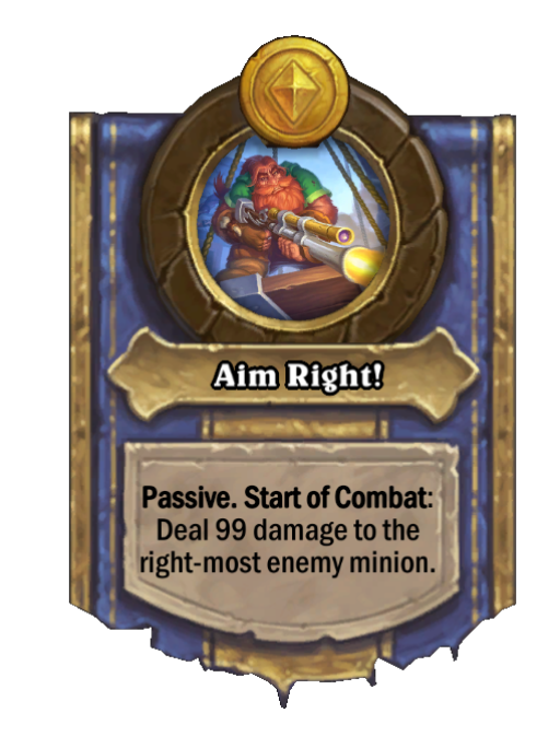 Aim Right! is a Hero Power in Hearthstone Battlegrounds. Effect: Passive. Start of Combat: Deal 99 damage to the right-most enemy minion. Created by: Deadeye. This card is no longer in the pool (Legacy).