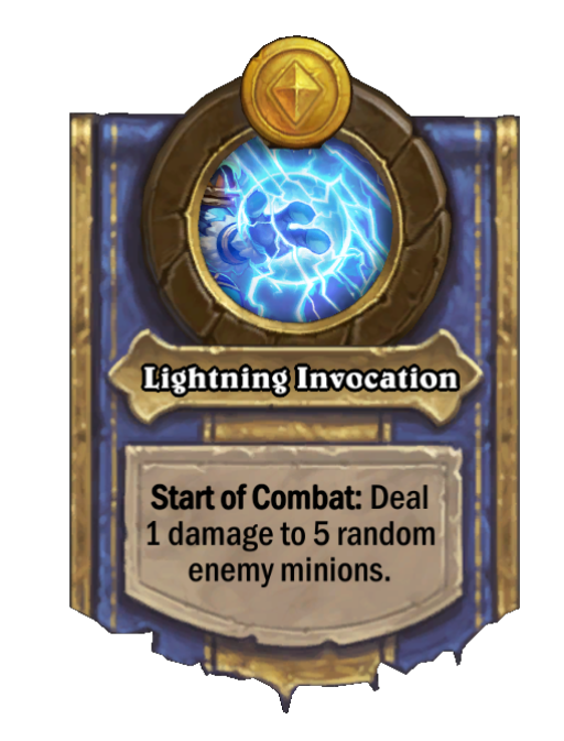 Lightning Invocation is a Hero Power in Hearthstone Battlegrounds featuring Start of Combat. Effect: Start of Combat: Deal 1 damage to 5 random enemy minions. Created by: Embrace the Elements.