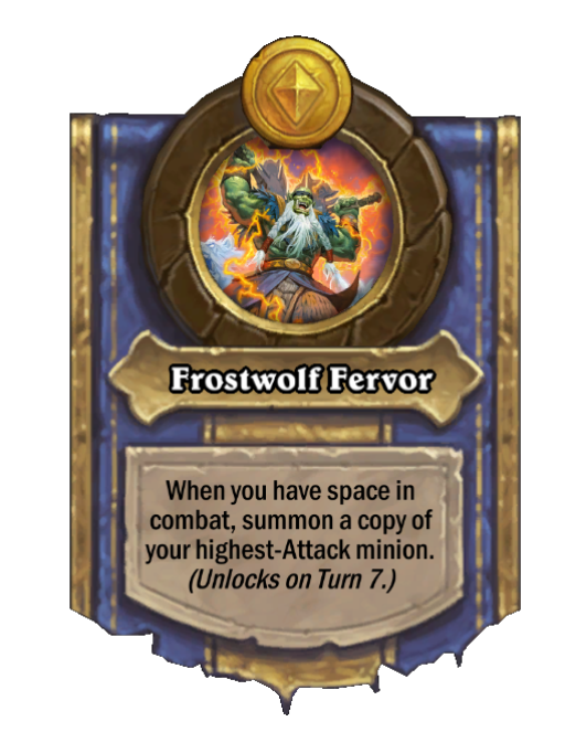 Frostwolf Fervor is a Hero Power in Hearthstone Battlegrounds. Effect: When you have space in combat, summon a copy of your highest-Attack minion. (Unlocks on Turn 7.). Created by: Drek'Thar.