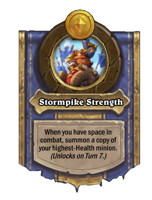 Stormpike Strength is a Hero Power in Hearthstone Battlegrounds. Effect: When you have space in combat, summon a copy of your highest-Health minion. (Unlocks on Turn 7.). Created by: Vanndar Stormpike.