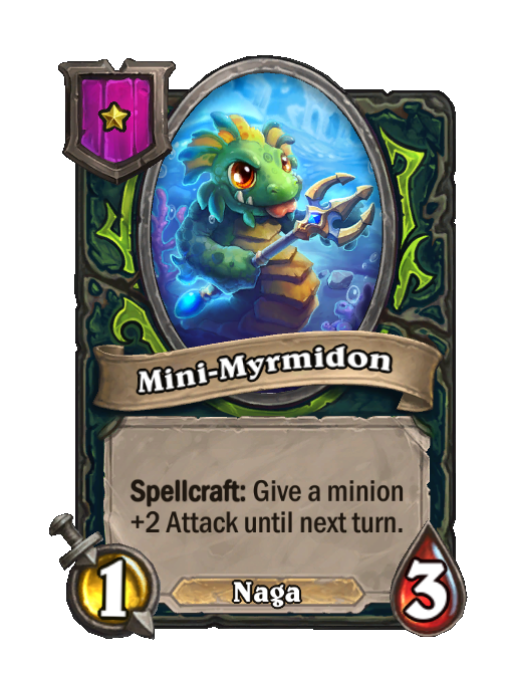 Mini-Myrmidon is a Tier 1 Naga Minion in Hearthstone Battlegrounds with 1/3 stats featuring Spellcraft. Effect: Spellcraft: Give a minion +2 Attack until next turn. This card is no longer in the pool (Legacy).