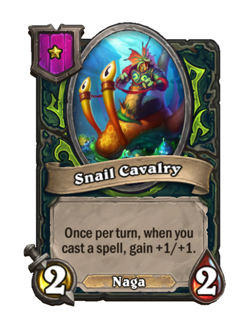 Snail Cavalry is a Tier 1 Naga Minion in Hearthstone Battlegrounds with 2/2 stats. Effect: Once per turn, when you cast a spell, gain +1/+1. This card is no longer in the pool (Legacy).