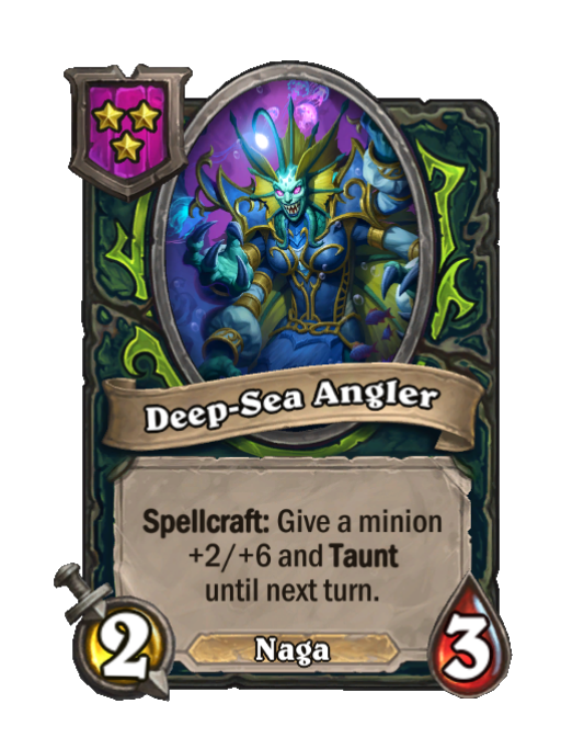 Deep-Sea Angler is a Tier 3 Naga Minion in Hearthstone Battlegrounds with 2/3 stats featuring Spellcraft. Effect: Spellcraft: Give a minion +2/+6 and Taunt until next turn.