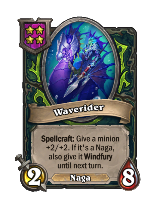 Waverider is a Tier 4 Naga Minion in Hearthstone Battlegrounds with 2/8 stats featuring Spellcraft. Effect: Spellcraft: Give a minion +2/+2. If it's a Naga, also give it Windfury until next turn.