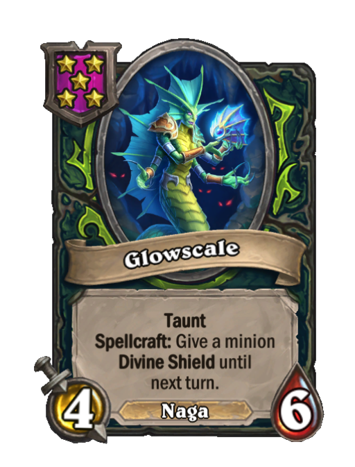 Glowscale is a Tier 5 Naga Minion in Hearthstone Battlegrounds with 4/6 stats featuring Taunt, Spellcraft. Effect: Taunt Spellcraft: Give a minion Divine Shield until next turn.