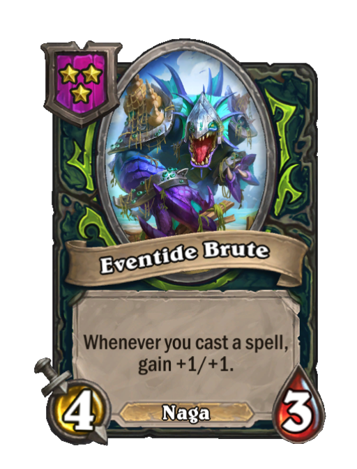 Eventide Brute is a Tier 3 Naga Minion in Hearthstone Battlegrounds with 4/3 stats. Effect: Whenever you cast a spell, gain +1/+1. This card is no longer in the pool (Legacy).