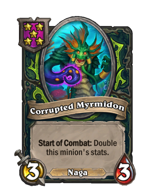 Corrupted Myrmidon is a Tier 5 Naga Minion in Hearthstone Battlegrounds with 3/3 stats featuring Start of Combat. Effect: Start of Combat: Double this minion's stats. This card is no longer in the pool (Legacy).