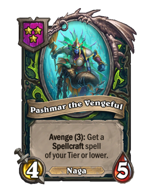 Pashmar the Vengeful is a Tier 3 Naga Minion in Hearthstone Battlegrounds with 4/5 stats featuring Avenge. Effect: Avenge (3): Get a Spellcraft spell of your Tier or lower. This card is no longer in the pool (Legacy).