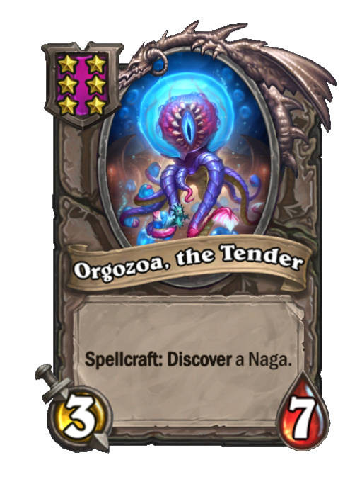Orgozoa, the Tender is a Tier 6 Minion in Hearthstone Battlegrounds with 3/7 stats featuring Spellcraft, Discover. Effect: Spellcraft: Discover a Naga. This card is no longer in the pool (Legacy).