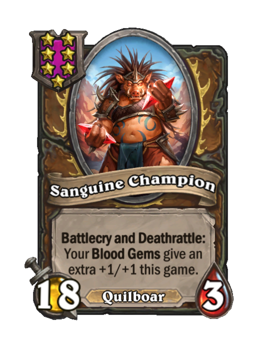 Sanguine Champion is a Tier 7 Quilboar Minion in Hearthstone Battlegrounds with 18/3 stats featuring Deathrattle, Battlecry. Effect: Battlecry and Deathrattle: Your Blood Gems give an extra +1/+1 this game.