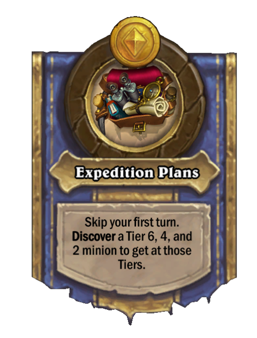 Expedition Plans is a Hero Power in Hearthstone Battlegrounds featuring Discover. Effect: Skip your first turn. Discover a Tier 6, 4, and 2 minion to get at those Tiers. Created by: Ambassador Faelin.