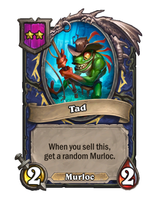 Tad is a Tier 2 Murloc Minion in Hearthstone Battlegrounds with 2/2 stats. Effect: When you sell this, get a random Murloc.