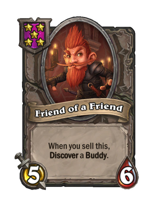 Friend of a Friend is a Tier 5 Minion in Hearthstone Battlegrounds with 5/6 stats featuring Discover. Effect: When you sell this, Discover a Buddy. This card is no longer in the pool (Legacy).