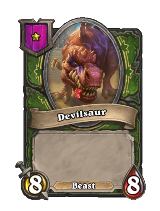 Devilsaur is a Tier 1 Beast Minion in Hearthstone Battlegrounds with 8/8 stats. Created by: Baby Krush. This card is no longer in the pool (Legacy).