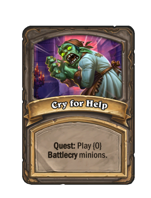 Cry for Help is a Quest in Hearthstone Battlegrounds. Effect: Quest: Play {0} Battlecry minions. This card is no longer in the pool (Legacy).