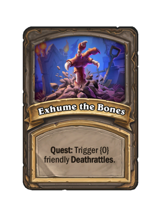 Exhume the Bones is a Quest in Hearthstone Battlegrounds. Effect: Quest: Trigger {0} friendly Deathrattles. This card is no longer in the pool (Legacy).