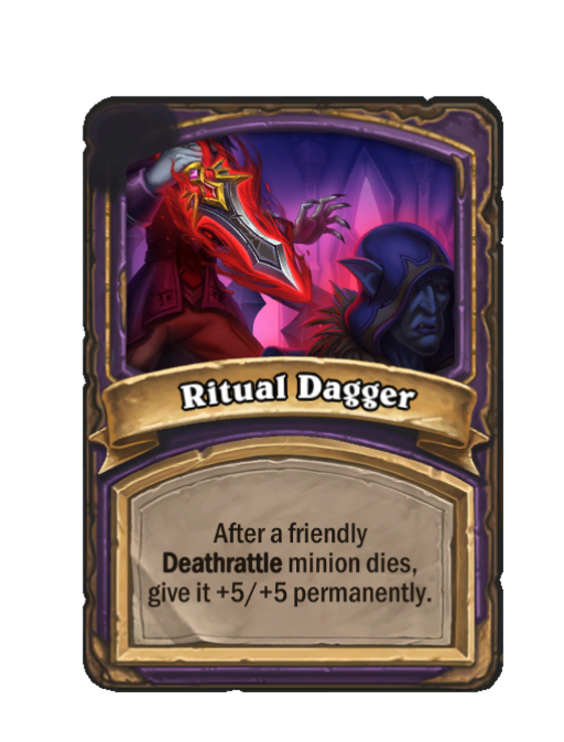 Ritual Dagger is a Reward in Hearthstone Battlegrounds. Effect: After a friendly Deathrattle minion dies, give it +5/+5 permanently. This card is no longer in the pool (Legacy).