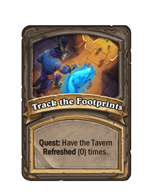 Track the Footprints is a Quest in Hearthstone Battlegrounds. Effect: Quest: Have the Tavern Refreshed {0} times. This card is no longer in the pool (Legacy).