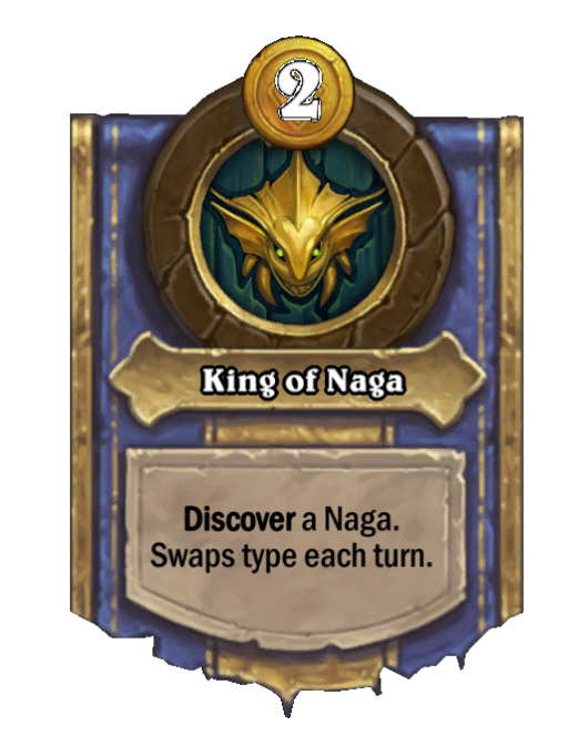 King of Naga is a Hero Power in Hearthstone Battlegrounds featuring Discover. Effect: Discover a Naga. Swaps type each turn. Costs 2 Gold. This card is no longer in the pool (Legacy).