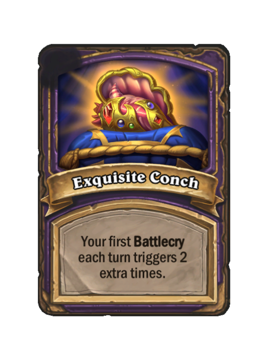 Exquisite Conch is a Reward in Hearthstone Battlegrounds. Effect: Your first Battlecry each turn triggers 2 extra times. This card is no longer in the pool (Legacy).