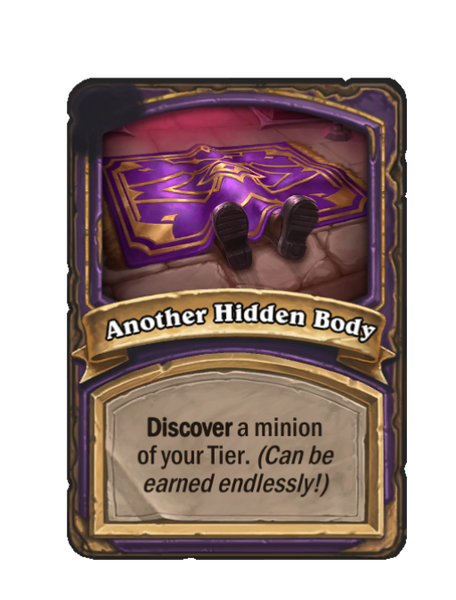 Another Hidden Body is a Reward in Hearthstone Battlegrounds featuring Discover. Effect: Discover a minion of your Tier. (Can be earned endlessly!). This card is no longer in the pool (Legacy).