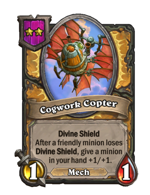 Cogwork Copter is a Tier 2 Mech Minion in Hearthstone Battlegrounds with 1/1 stats featuring Divine Shield. Effect: Divine Shield After a friendly minion loses Divine Shield, give a minion in your hand +1/+1. This card is no longer in the pool (Legacy).