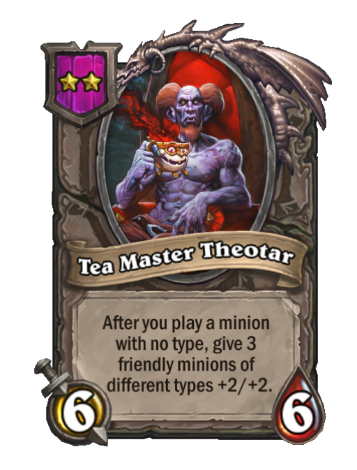 Tea Master Theotar is a Tier 2 Minion in Hearthstone Battlegrounds with 6/6 stats. Effect: After you play a minion with no type, give 3 friendly minions of __different types +2/+2. This card is no longer in the pool (Legacy).