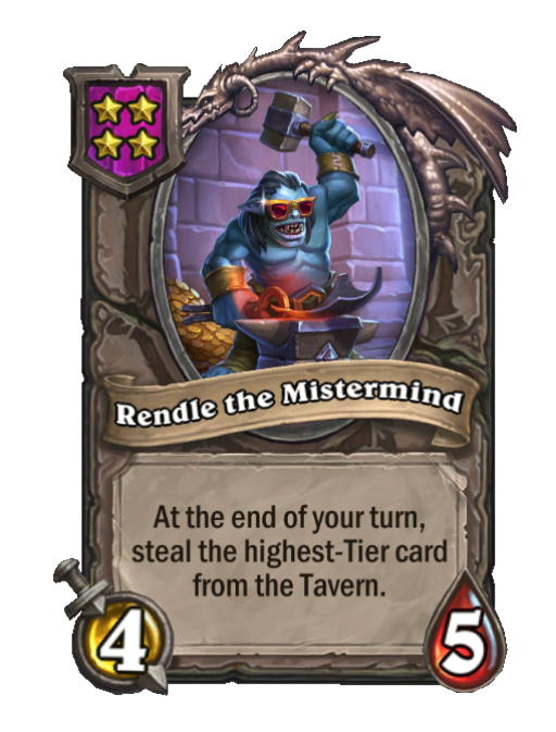 Rendle the Mistermind is a Tier 4 Minion in Hearthstone Battlegrounds with 4/5 stats featuring End of Turn. Effect: At the end of your turn, steal the highest-Tier card from the Tavern. This card is no longer in the pool (Legacy).