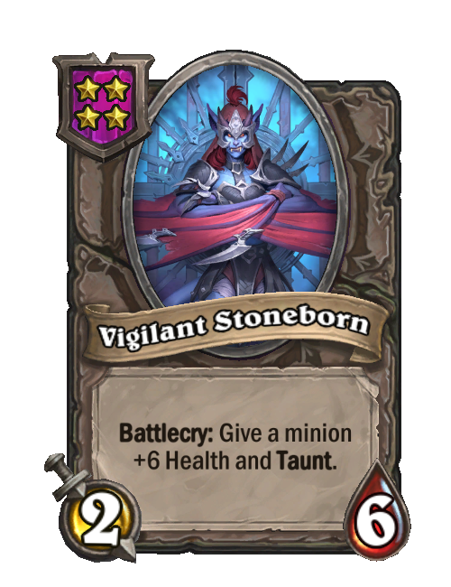 Vigilant Stoneborn is a Tier 4 Minion in Hearthstone Battlegrounds with 2/6 stats featuring Battlecry. Effect: Battlecry: Give a minion +6 Health and Taunt. This card is no longer in the pool (Legacy).