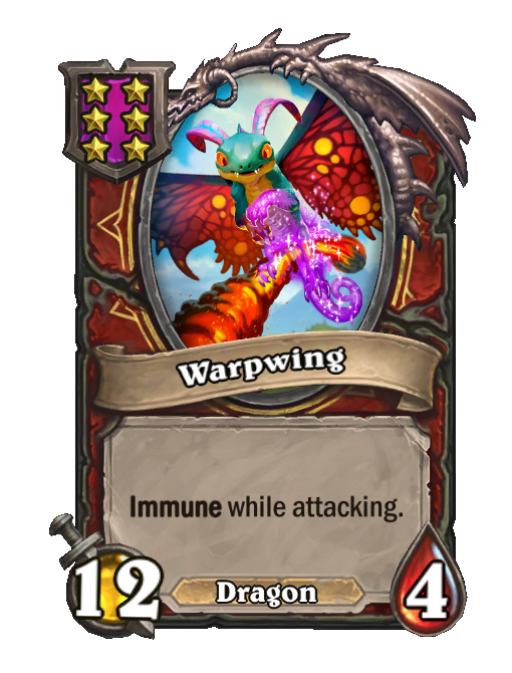 Warpwing is a Tier 6 Dragon Minion in Hearthstone Battlegrounds with 12/4 stats featuring Immune. Effect: Immune while attacking. This card is no longer in the pool (Legacy).