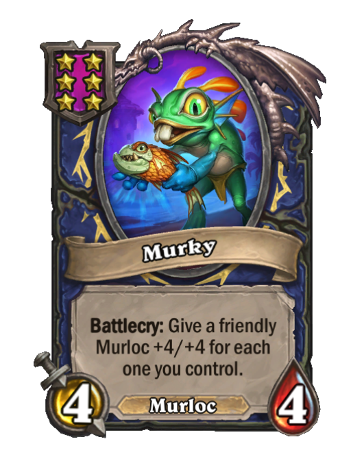 Murky is a Tier 6 Murloc Minion in Hearthstone Battlegrounds with 4/4 stats featuring Battlecry. Effect: Battlecry: Give a friendly Murloc +4/+4 for each one you control. This card is no longer in the pool (Legacy).