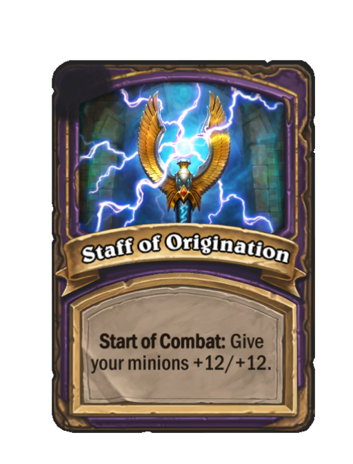 Staff of Origination is a Reward in Hearthstone Battlegrounds featuring Start of Combat. Effect: Start of Combat: Give your minions +12/+12. This card is no longer in the pool (Legacy).