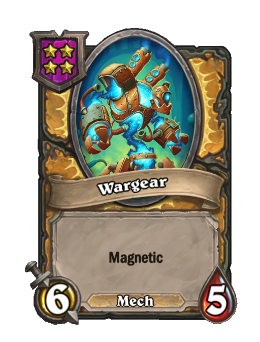 Wargear is a Tier 4 Mech Minion in Hearthstone Battlegrounds with 6/5 stats featuring Magnetic. Effect: Magnetic. This card is no longer in the pool (Legacy).