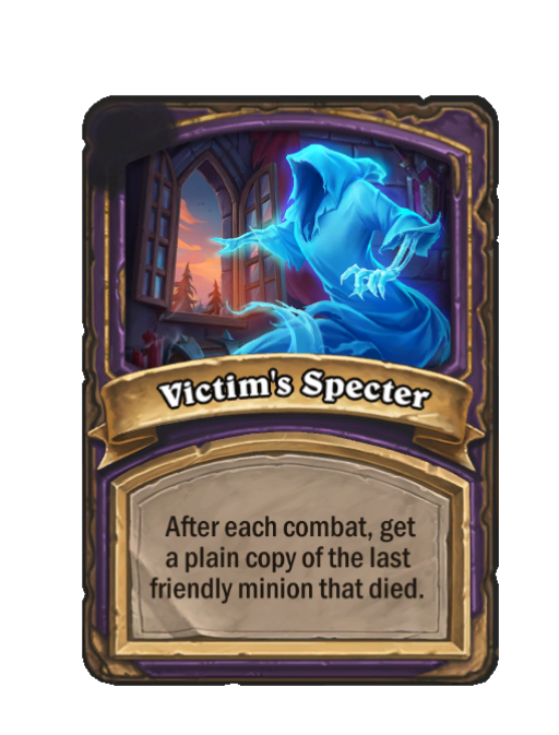 Victim's Specter is a Reward in Hearthstone Battlegrounds. Effect: After each combat, get a plain copy of the last friendly minion that died.