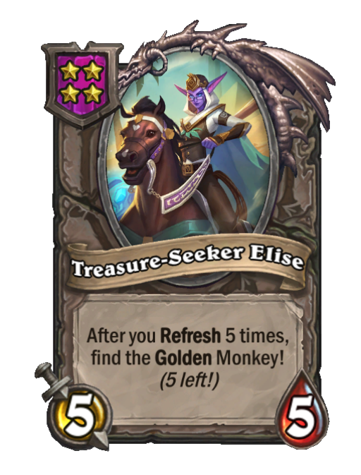 Treasure-Seeker Elise is a Tier 4 Minion in Hearthstone Battlegrounds with 5/5 stats. Effect: After you Refresh 5 times, find the Golden Monkey! (5 left!). This card is no longer in the pool (Legacy).