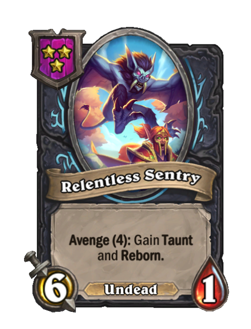Relentless Sentry is a Tier 3 Undead Minion in Hearthstone Battlegrounds with 6/1 stats featuring Avenge. Effect: Avenge (4): Gain Taunt and Reborn. This card is no longer in the pool (Legacy).