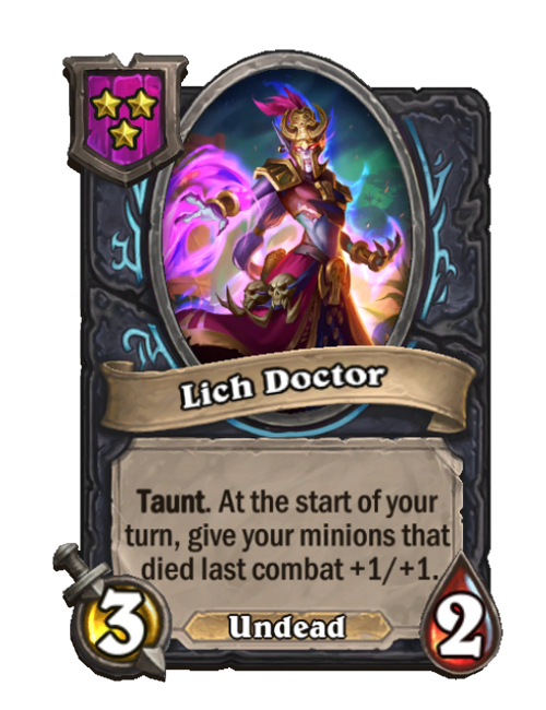 Lich Doctor is a Tier 3 Undead Minion in Hearthstone Battlegrounds with 3/2 stats featuring Taunt. Effect: Taunt. At the start of your turn, give your minions that died last combat +1/+1. This card is no longer in the pool (Legacy).
