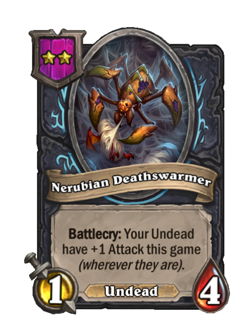 Nerubian Deathswarmer is a Tier 2 Undead Minion in Hearthstone Battlegrounds with 1/4 stats featuring Battlecry. Effect: Battlecry: Your Undead have +1 Attack this game (wherever they are).