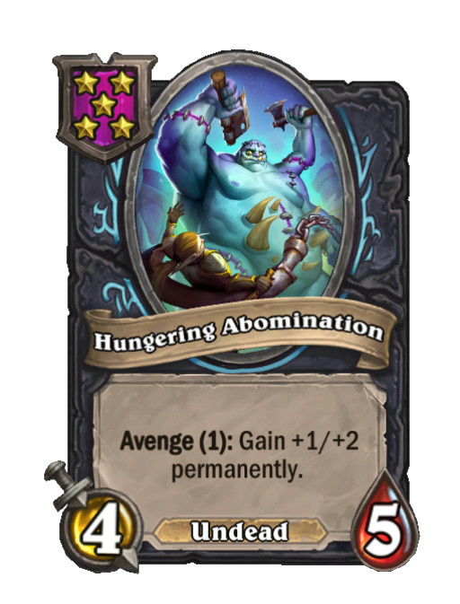 Hungering Abomination is a Tier 5 Undead Minion in Hearthstone Battlegrounds with 4/5 stats featuring Avenge. Effect: Avenge (1): Gain +1/+2 permanently. This card is no longer in the pool (Legacy).