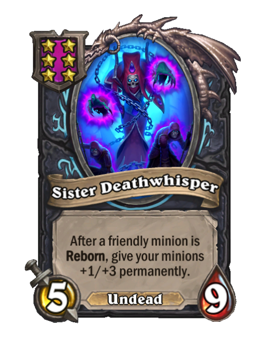 Sister Deathwhisper is a Tier 6 Undead Minion in Hearthstone Battlegrounds with 5/9 stats. Effect: After a friendly minion is Reborn, give your minions +1/+3 permanently. This card is no longer in the pool (Legacy).