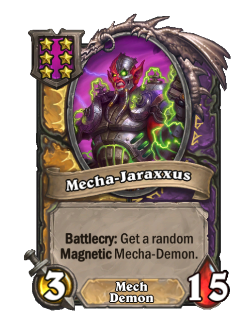 Mecha-Jaraxxus is a Tier 6 Mech/Demon Minion in Hearthstone Battlegrounds with 3/15 stats featuring Battlecry. Effect: Battlecry: Get a random Magnetic Mecha-Demon. This card is no longer in the pool (Legacy).
