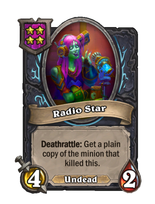 Radio Star is a Tier 4 Undead Minion in Hearthstone Battlegrounds with 4/2 stats featuring Deathrattle. Effect: Deathrattle: Get a plain copy of the minion that __killed this. This card is no longer in the pool (Legacy).
