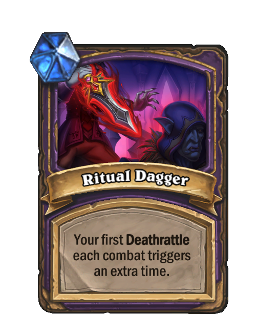 Ritual Dagger is a Reward in Hearthstone Battlegrounds. Effect: Your first Deathrattle each combat triggers an extra time. This card is no longer in the pool (Legacy).