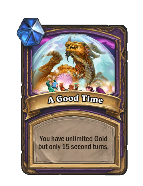A Good Time is a Reward in Hearthstone Battlegrounds. Effect: You have unlimited Gold but only 15 second turns. This card is no longer in the pool (Legacy).