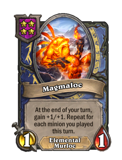 Magmaloc is a Tier 4 Elemental/Murloc Minion in Hearthstone Battlegrounds with 1/1 stats featuring End of Turn. Effect: At the end of your turn, gain +1/+1. Repeat for each minion you played this turn. This card is no longer in the pool (Legacy).