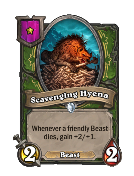 Scavenging Hyena is a Tier 1 Beast Minion in Hearthstone Battlegrounds with 2/2 stats. Effect: Whenever a friendly Beast dies, gain +2/+1. This card is no longer in the pool (Legacy).