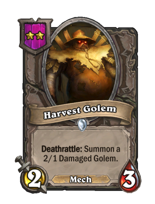 Harvest Golem is a Tier 2 Mech Minion in Hearthstone Battlegrounds with 2/3 stats featuring Deathrattle. Effect: Deathrattle: Summon a 2/1 Damaged Golem. This card is no longer in the pool (Legacy).