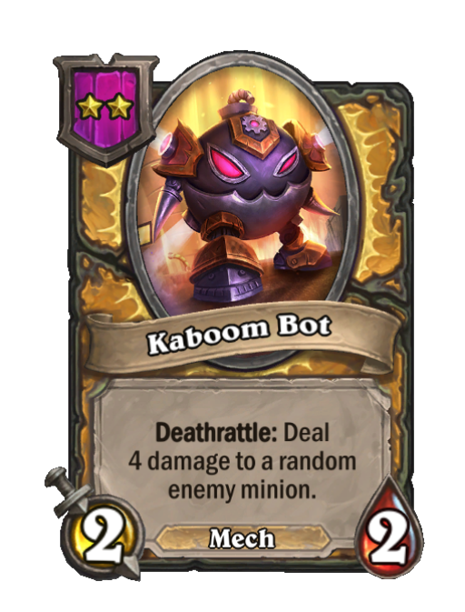 Kaboom Bot is a Tier 2 Mech Minion in Hearthstone Battlegrounds with 2/2 stats featuring Deathrattle. Effect: Deathrattle: Deal 4_damage to a random enemy minion. This card is no longer in the pool (Legacy).