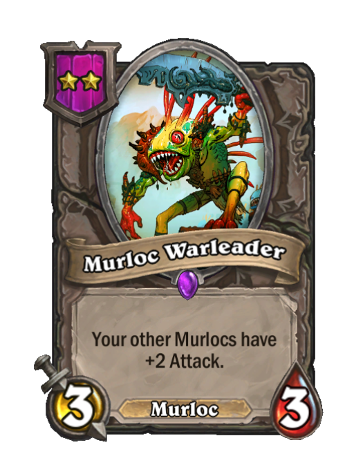 Murloc Warleader is a Tier 2 Murloc Minion in Hearthstone Battlegrounds with 3/3 stats featuring Aura. Effect: Your other Murlocs have +2 Attack. This card is no longer in the pool (Legacy).